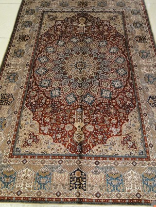 圖片產(chǎn)品說明:品名:天然手工編織絲毯(真絲地毯) 品牌:億絲東方絲毯 編號:T04592 尺寸:4×6英尺 色調(diào):紅色加米色系 此圖案為傳統(tǒng)波斯紋樣,經(jīng)典低調(diào)不失奢華。適合于各種裝修風(fēng)格 |