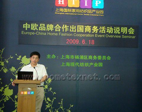 6月18日,“2009中歐品牌合作商務(wù)活動(dòng)”在家紡園隆重召開。來自向比利時(shí)、荷蘭、法國、意大利、德國和西班牙各使館、商會(huì)以及50余家企業(yè)家代表匯集參加了說明會(huì)。作為主辦單位的上海市楊浦區(qū)商務(wù)委員會(huì)經(jīng)琪主任,上海現(xiàn)代紡織產(chǎn)業(yè)園總經(jīng)理周根生親自對(duì)此次活動(dòng)的開幕致辭!